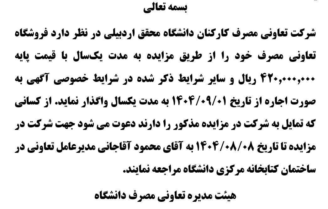 بدینوسیله به اطلاع می رساند شرکت تعاونی مصرف کارکنان دانشگاه، فروشگاه تعاونی مصرف به آدرس خیابان دانشگاه روبروی بانک تجارت را با قیمت پایه کارشناسی به مبلغ ۵۰۰.۰۰۰.۰۰۰ ریال ماهانه و جمعا به مبلغ ۶.۰۰۰.۰۰۰.۰۰۰ ریال به مدت یک سال شمسی از تاریخ ۱ مهر ماه ۱۴۰۴ لغایت ۳۱ شهریور ۱۴۰۵ به صورت اجاره واگذار نماید.