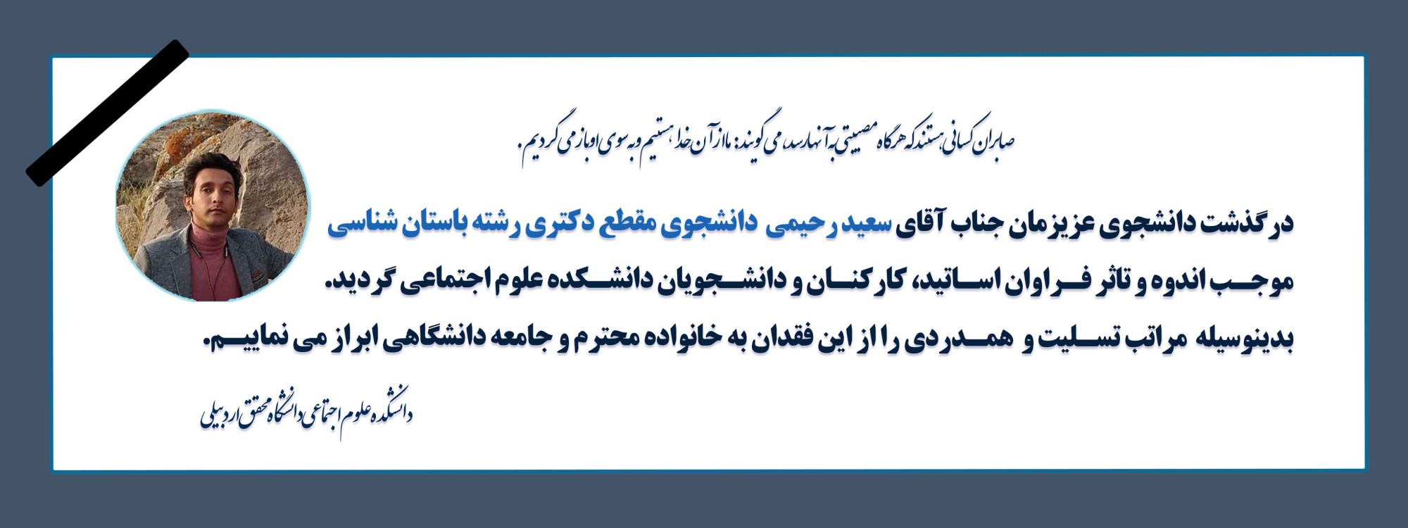 ▪️فوت نابهنگام جناب آقای سعید رحیمی چنان سنگین و جانگداز است که به صعوبت و سختی به باور می نشیند، ولی در برابر مشیت مهربان پروردگار یکتا چاره ای جز فاسپردن و تمکین و تراضی به آن چه خدا می خواهد، نیست. این ماتم جانسوز را خدمت خانواده محترم آن مرحوم، دانشجویان گرامی و اساتید محترم گروه آموزشی باستان شناسی از ته دل تسلیت و تعزیت عرض نموده و برای آن عزیز سفر کرده، علو درجات و رحمت واسعه الهی طلب می کنم.