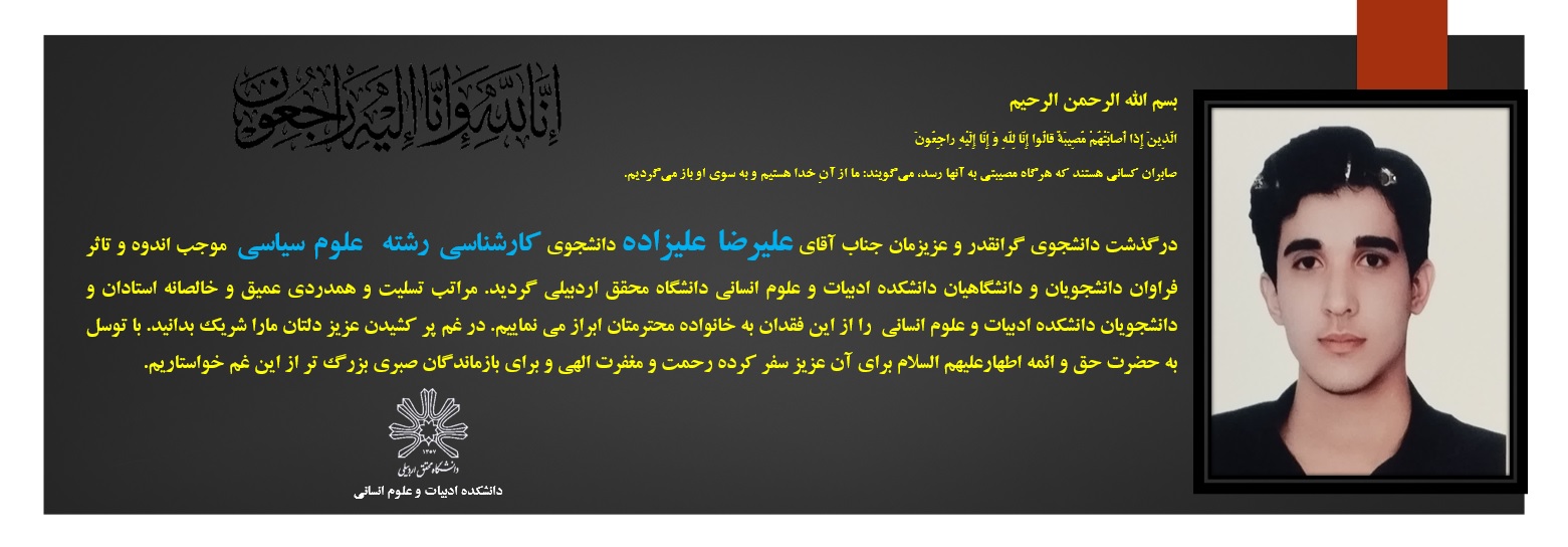 درگذشت دانشجوی گرانقدر و عزیزمان جناب آقای علیرضا علیزاده دانشجوی کارشناسی رشته علوم سیاسی موجب اندوه و تاثر فراوان دانشجویان و دانشگاهیان دانشگاه محقق اردبیلی - دانشکده ادبیات و علوم انسانی گردید.